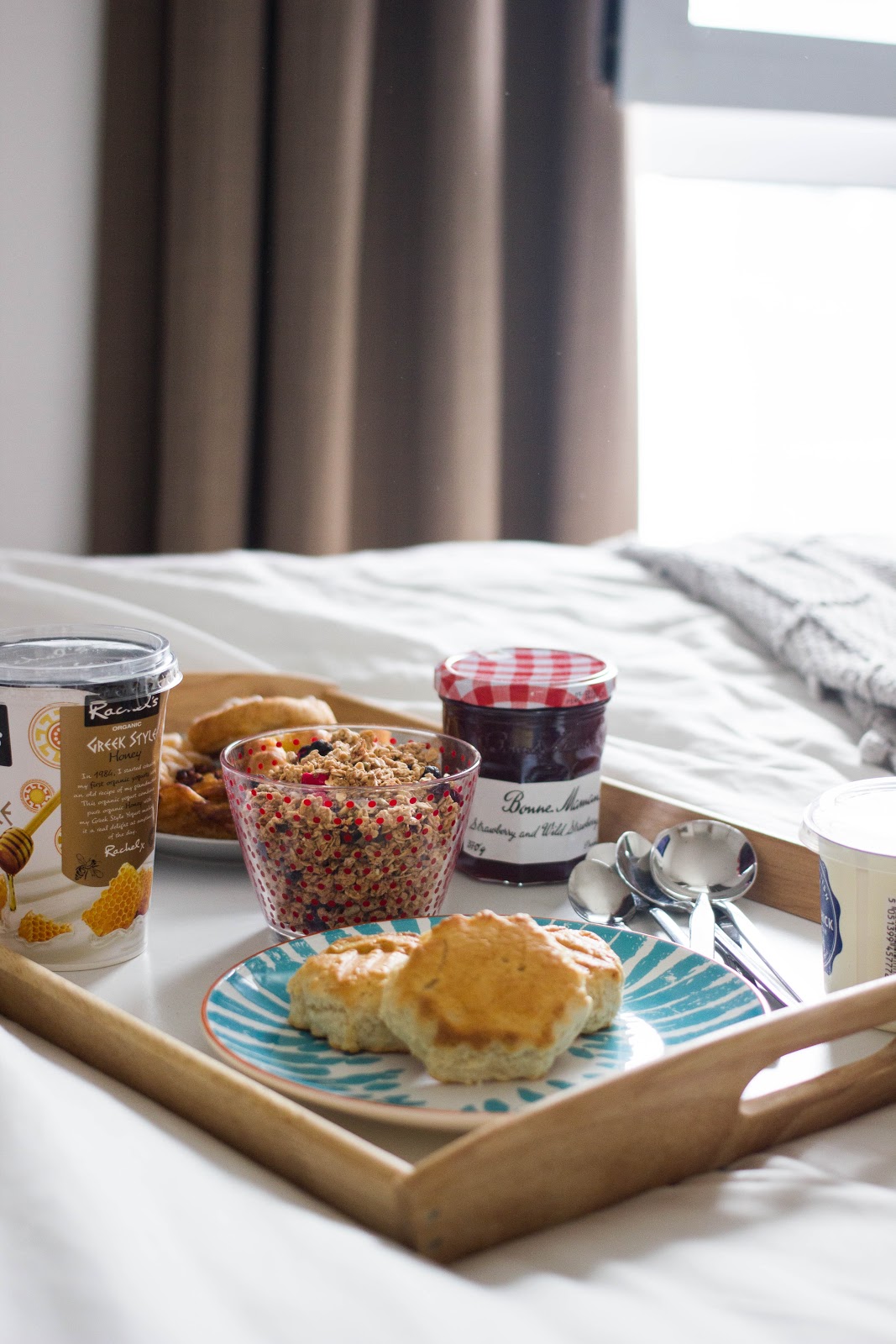 With my current favourite Spotify playlist on in the background, we tucked into breakfast, whilst flicking through the paper together, chatting about the articles. I had a big bowl of my favourite granola, topped with greek yogurt with honey and a half a ton of berries, followed by all the pastries, and Con went for a very British option of Scones.
